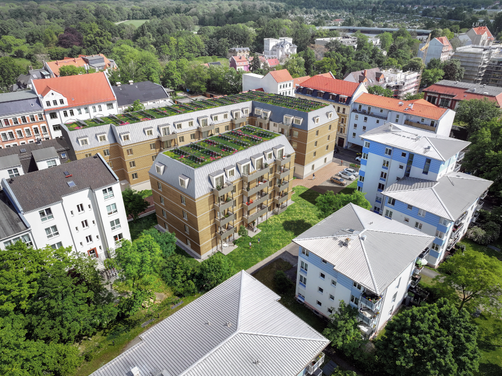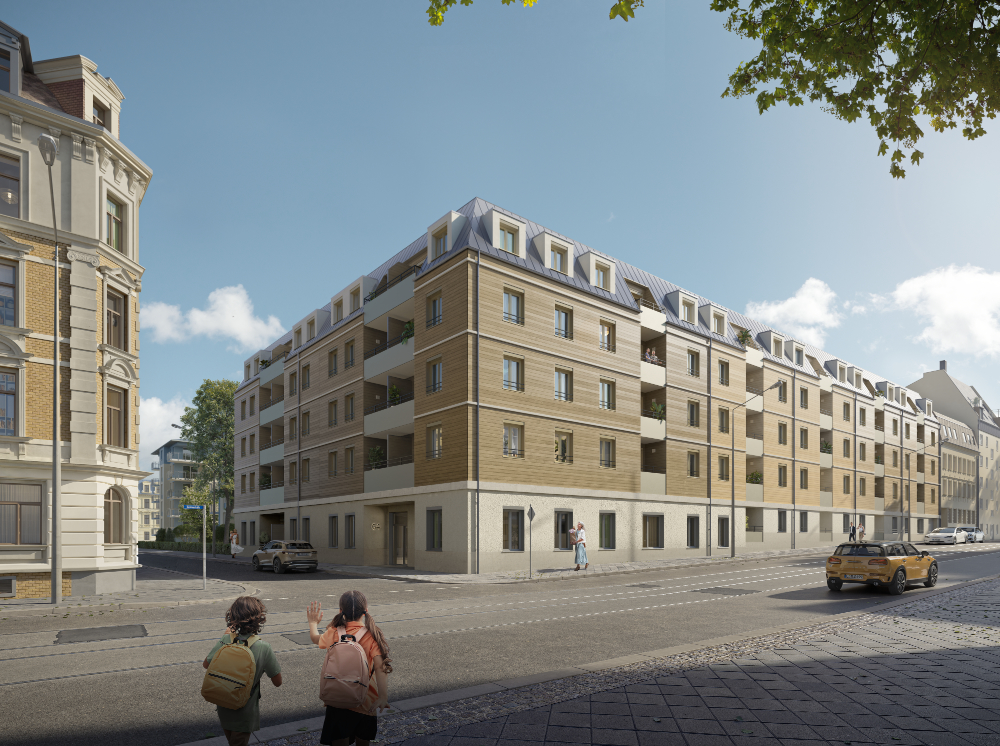 In der Dieskaustraße 64-68 entsteht bis zum 1. Quartal 2026 eine moderne Wohnanlage für Senioren mit insgesamt 89 barrierefreien Wohnungen. Der Neubaukomplex in Holzhybrid-Bauweise, bestehend aus zwei Gebäudeteilen mit Vorder- und Hinterhaus, befindet sich im Westen Leipzigs – im Stadtteil Kleinzschocher. Die komfortablen 2- und 3-Raumwohnungen mit Wohnflächen zwischen 41 und 71 m² verfügen über Balkon, Terrasse oder Loggia und sind bequem per Aufzug erreichbar. Jede Wohneinheit ist entsprechend altersgerecht ausgestattet und beinhaltet Fußbodenheizung, Bad mit ebenerdiger Dusche, elektrische Rollläden und Videosprechanlage. Auch eine hochwertige Einbauküche mit Geschirrspüler und Mikrowelle ist bereits enthalten. Wenn gewünscht, kann ein Tiefgaragenplatz (von insgesamt 13 Stellplätzen) zusätzlich angemietet werden. Somit sind alle Voraussetzungen gegeben, die ein sorgenfreies Leben und Wohnen im Alter ermöglichen.